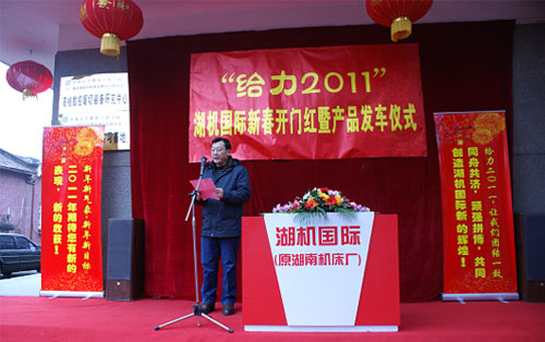 2011年2月10日農(nóng)歷初八,“給力2011”湖機(jī)國(guó)際新春開門紅暨產(chǎn)品發(fā)車儀式在劉年紅董事長(zhǎng)的新年致詞中開始了。